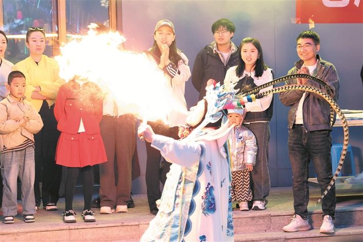 10月7日,在五师双河市星光夜市,非遗表演艺人的精彩表演,吸引众多市民和游客驻足观赏。岳佳豪 摄