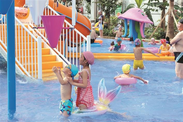 10月8日,游客在双河古道温泉康养中心玩水嬉戏。雷蕾 摄