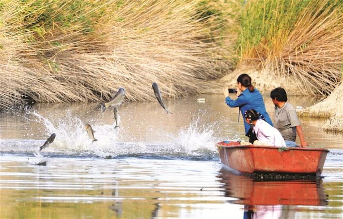 10月2日,游客在五师八十三团鱼塘打卡拍照。沈志君 摄