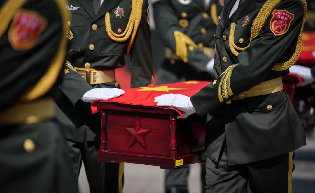 9月13日,礼兵护送志愿军烈士棺椁走向沈阳抗美援朝烈士陵园安葬地宫。新华社记者 潘昱龙 摄