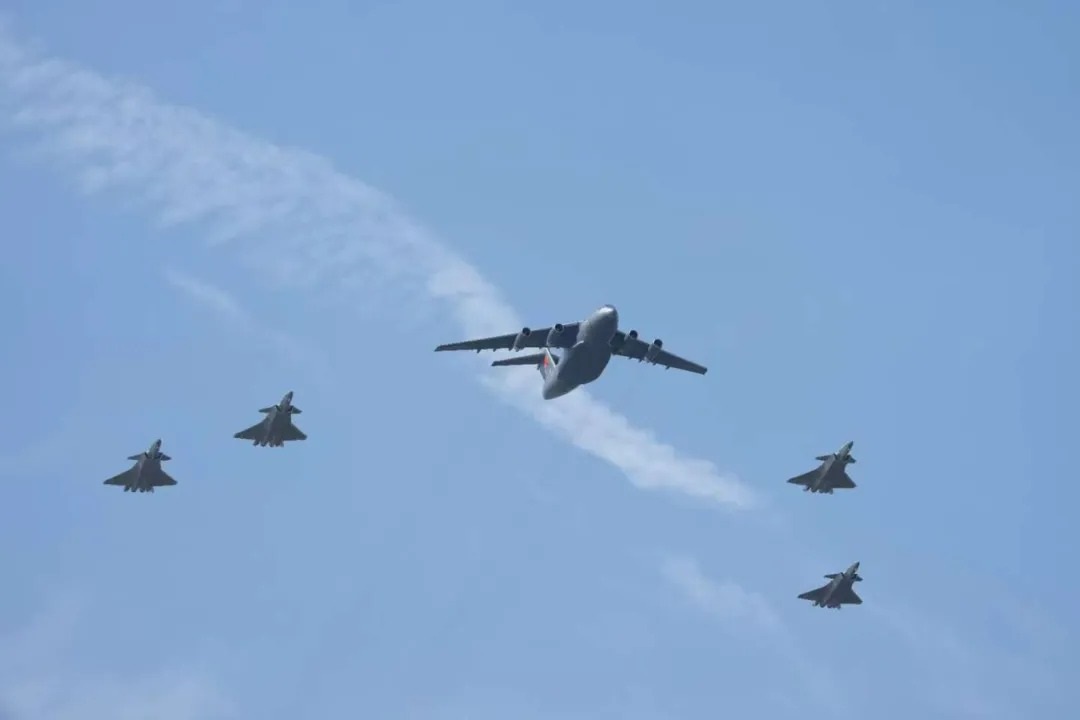 9月12日,第十二批在韩中国人民志愿军烈士遗骸回国。这是在沈阳桃仙国际机场,接运烈士遗骸回国的运-20专机在4架歼-20飞机伴飞护航下即将降落。新华社记者 潘昱龙 摄