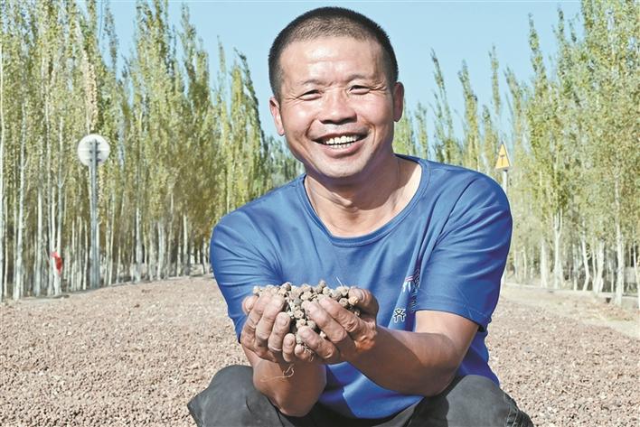 9月30日,三师五十四团二连职工古仲其手捧采收的油莎豆,喜笑颜开。兵团日报常驻记者 李芸 通讯员 石佳阳 摄