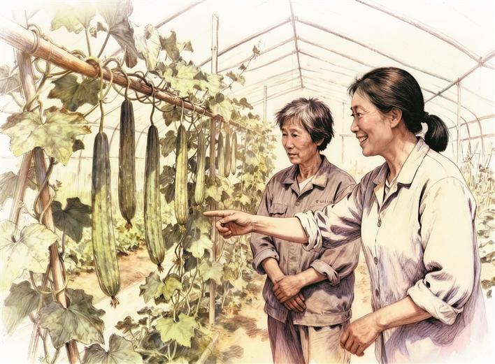 ⑨2012年,连队困难职工余世美承包了一座蔬菜大棚。作为丝瓜种植负责人的朱广兰将新品种丝瓜优先安排给余世美种植,并为她提供技术指导。当年,余世美收入9.7万元。