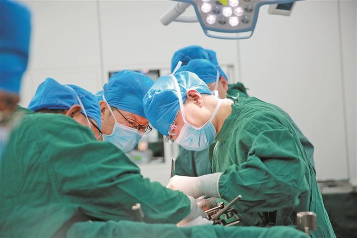 无影灯下,马涛(右一)带领医疗团队为患者实施手术(资料图片)。黄叶叶 摄