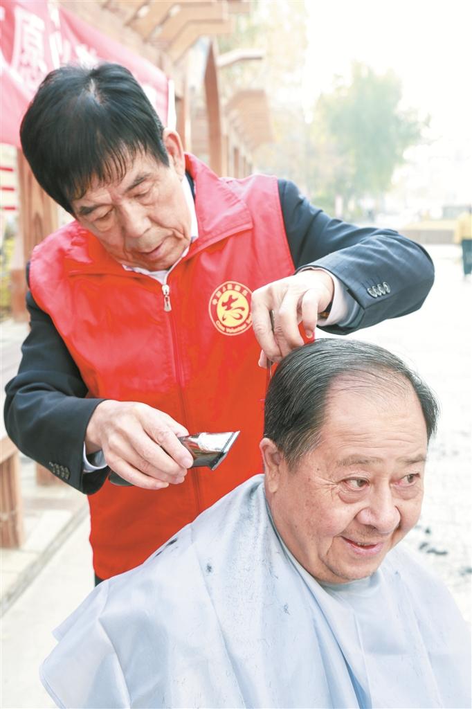 10月29日,六师五家渠市人民路街道北海东街社区党员马登先(左)为小区老人义务理发。闻新 摄