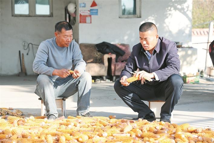 10月10日,六师一〇二团四连党支部书记、连管会指导员郑洪林(右)到职工家中了解玉米收成情况。朱小丽 杜仪 摄