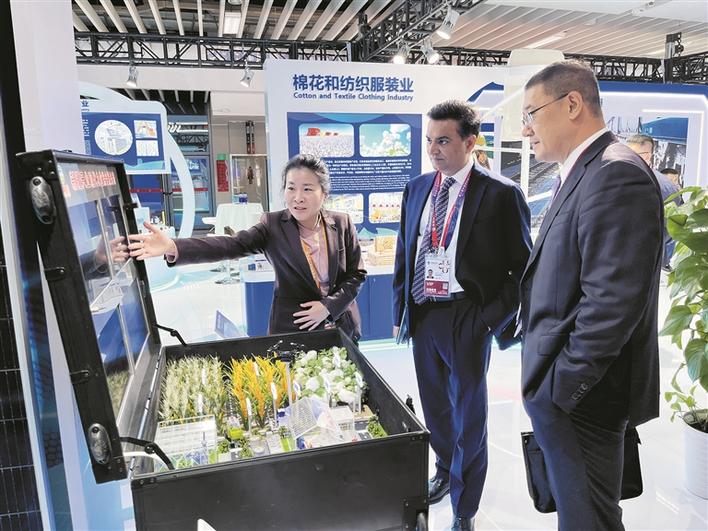 11月5日,第八届中国国际进口博览会在国家会展中心(上海)开幕。图为在兵团展位前,工作人员向参展客商介绍兵团现代农业高效节水技术。兵团日报全媒体记者 刘美惠子 摄