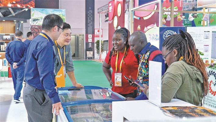 11月7日,在第八届中国国际进口博览会农食产品展区,参展商了解国外产品。兵团日报全媒体记者 李柏成 摄