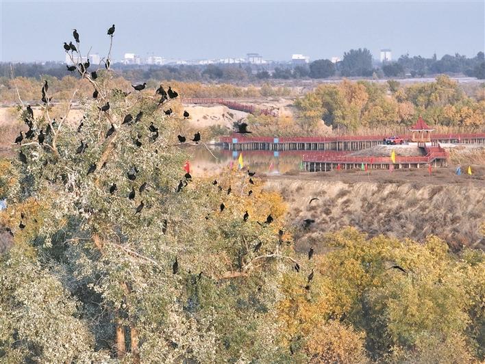 迁徙中的鸬鹚在胡杨河国家湿地公园驻足栖息(摄于11月2日)。徐玥 摄