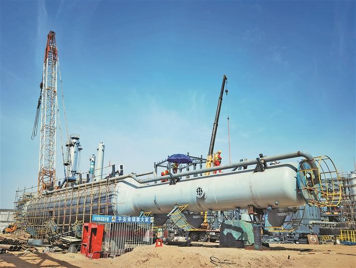 在新疆中科能源科技有限公司煤制活性炭及炭化尾气联产LNG一体化项目建设现场,工人们加紧安装设备(资料图片)。今年以来,十三师新星市工业、农业、交通、生态、水利等领域建设项目投资稳步快速增长,有力推动了传统产业焕新、新兴产业壮大、未来产业培育。兵团日报全媒体记者 姜蒙 通讯员 商凯旋 摄