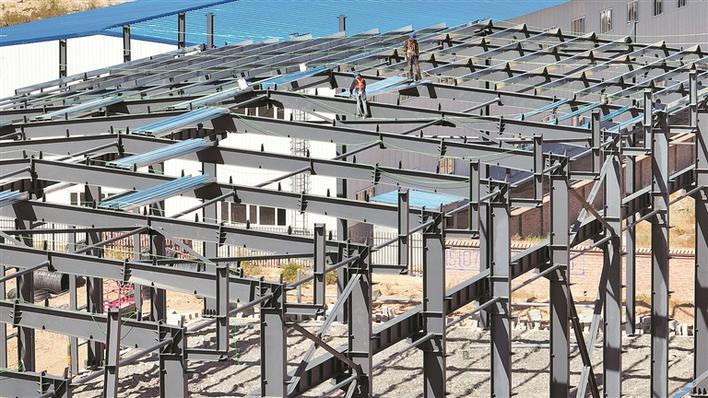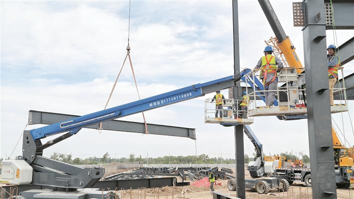 在十二师五一农场高达科技跨境电商航空物流园项目建设现场,施工人员进行钢结构吊装作业(资料图片)。今年前三季度,十二师抓实项目引进和落地开工,抓细项目要素保障和服务,确保重大项目早落地早建成早投产。兵团日报常驻记者 田园 摄