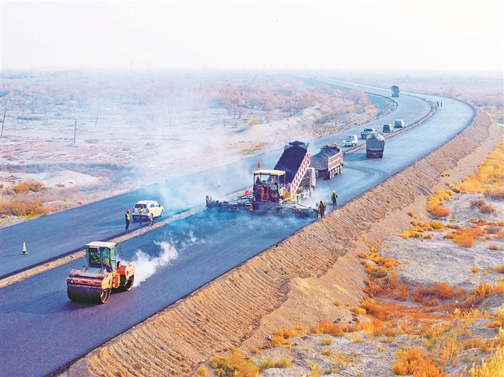 五师双河市—九〇团—精阿高速公路项目施工现场(资料图片)。今年前三季度,五师双河市持续扩大交通有效投资,打造“四横四纵”市域交通主通道,提升多式联运效率与物流综合服务水平,形成连通博乐市、阿拉山口市、精河县的“1小时交通圈”。秦桂连 摄