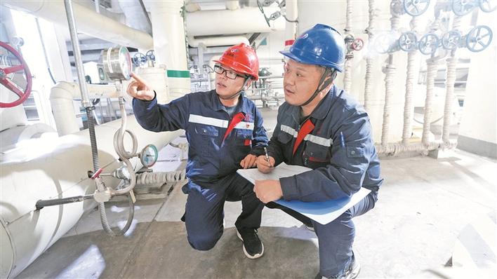 11月13日,新疆屯富热电有限责任公司党员夏述兵(左)和同事在巡查供热设备运行情况。兵团日报常驻记者 李正虎 摄