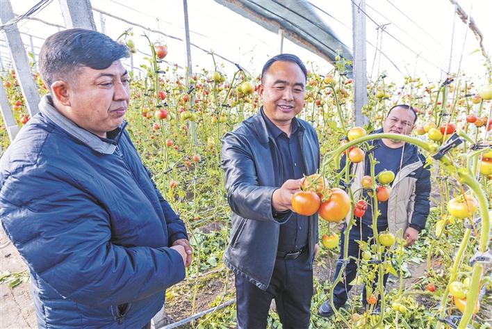 11月12日,在二师二十九团园九连设施农业大棚内,该连党支部书记、连管会指导员王海祥(中)为库尔勒市兰干乡结帕尔村村民讲解西红柿种植技术。兵团日报常驻记者 李嘉成 摄