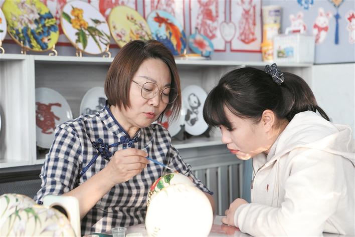 10月21日,彭春梅(左)教冯玲慧在鸵鸟蛋上创作掐丝珐琅作品。张培丽 摄