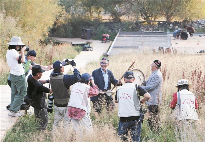 十三师黄田农场哈密十二木卡姆演奏队在八大石古村落遗址景区演奏哈密木卡姆(资料图片)。兵团日报常驻记者 李欣奕 摄