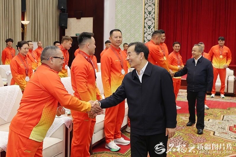 12月4日,自治区党委书记陈小江、自治区主席艾尔肯·吐尼亚孜同载誉归来的第十五届全国运动会新疆体育代表团获奖运动员、教练员代表亲切交谈,代表自治区党委和政府向他们表示热烈祝贺。天山网-新疆日报记者 崔志坚 摄