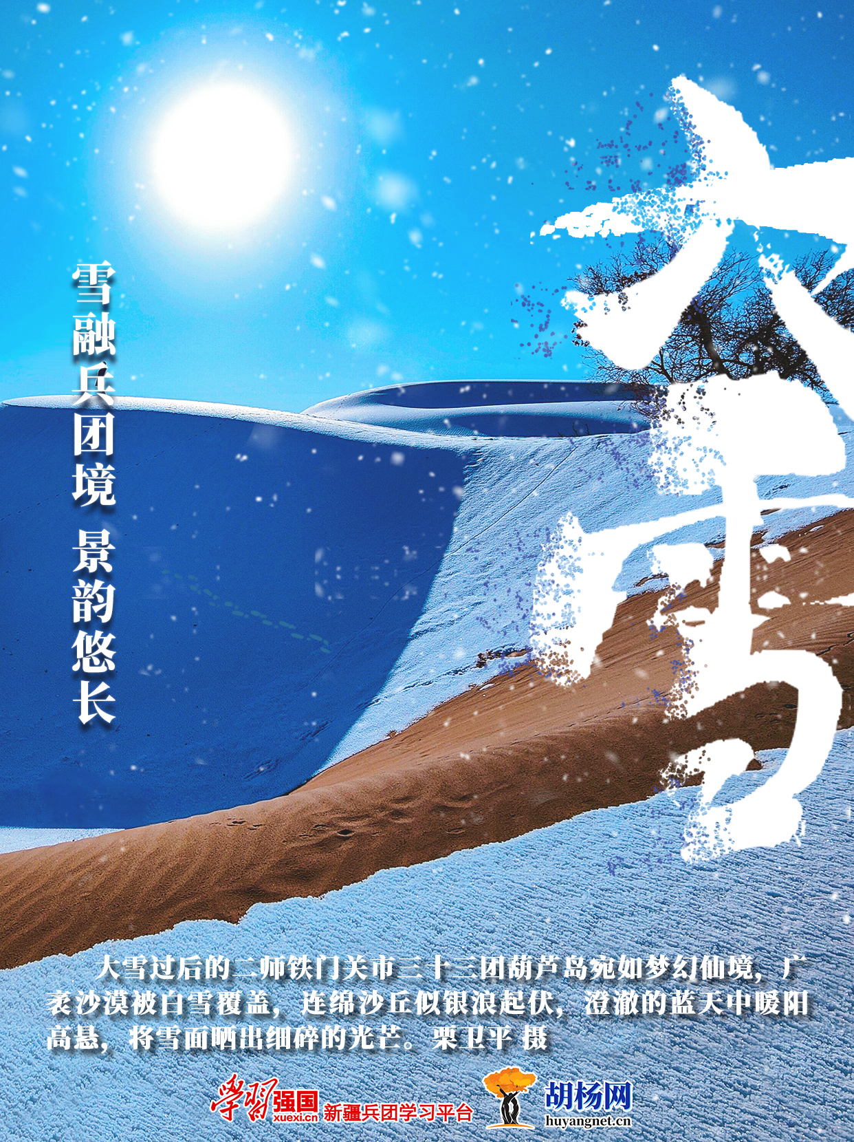 大雪,至此而雪盛。《月令七十二候集解》载:“大雪,十一月节。大者,盛也。至此而雪盛矣。”此时的兵团,沙漠、道路、田野、山野皆被白雪覆盖,尽显大雪节气的苍茫与静谧。