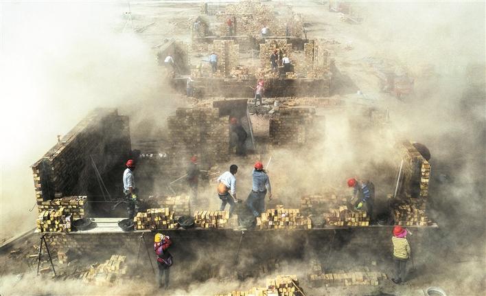 三师五十一团职工顶着风沙在塔克拉玛干沙漠边缘建设抗震安居房(资料图片)。五十一团将保障和改善民生作为首要任务,积极推进保障性住房与抗震安居房建设,让职工群众安居乐业,获得感、幸福感、安全感进一步增强。