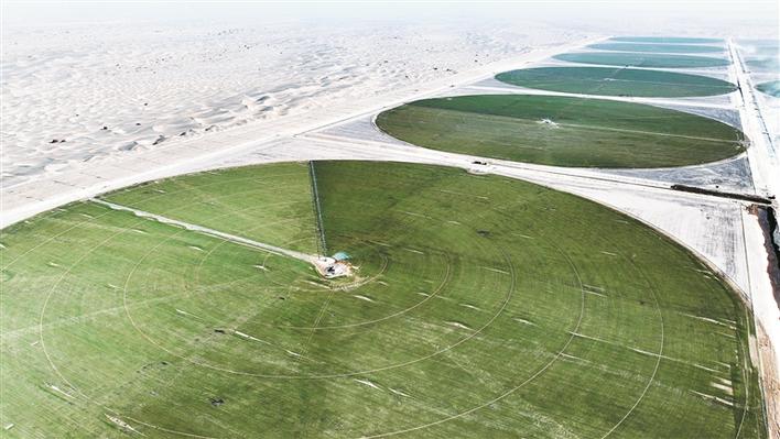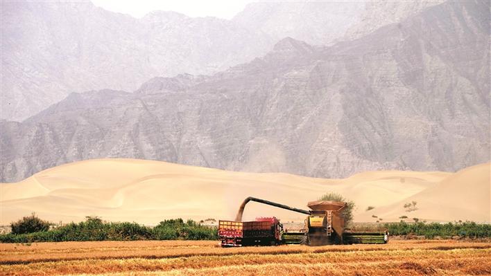 在位于塔克拉玛干沙漠西缘的三师四十九团三连,沙地经改良后,种植的小麦喜获丰收(资料图片)。三师图木舒克市坚持良法、良种、良田、良机、良技融合配套,推进稳粮、优棉、强果、兴畜、促特色,将荒原碱滩变为绵延千里的良田沃野,实现“绿富同兴”。