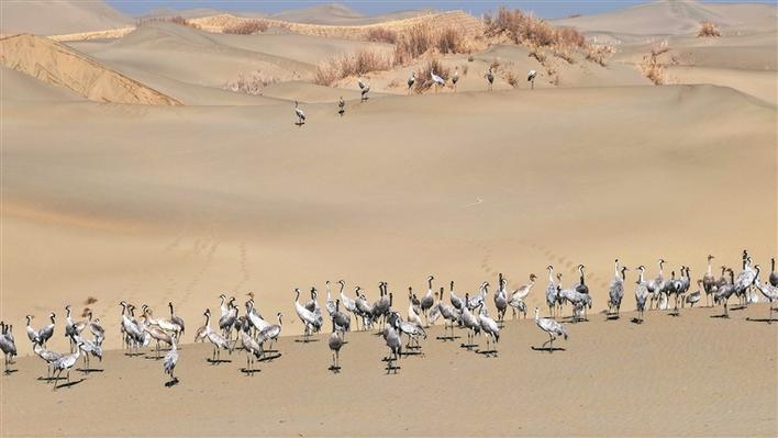 一群灰鹤在十四师和墨洛产业园内栖息(摄于11月28日)。近年来,地处塔克拉玛干沙漠南缘的和墨洛产业园积极探索“草方格+防护林+经济林+油莎豆”的绿色生态发展模式,逐步构建起坚实的生态屏障,区域生态环境得到有效改善,吸引了各类野生动物前来安家“落户”,实现人与自然和谐发展。