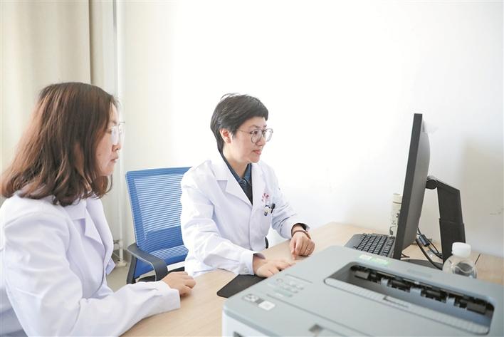 12月8日,四师可克达拉市人民医院中医科副主任、镇江援疆医生丁小星(右)在和同事交流诊疗经验。兵团日报常驻记者 杨俊钦 摄