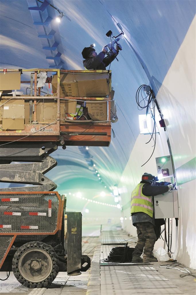 12月16日,G0711线乌鲁木齐至尉犁高速公路天山胜利隧道内,工作人员安装多光谱火灾监测设备。天山胜利隧道全长22.13公里,是世界最长高速公路隧道,采用全球首创“三洞+四竖井”施工方案,攻克高寒高海拔、16处地质断裂带等多重难题,穿越天山仅需20分钟。兵团日报全媒体记者 李柏成 摄