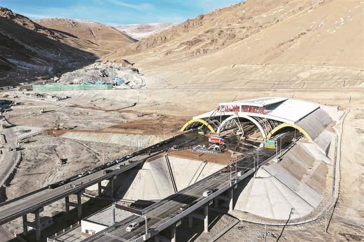 航拍的中国交建新疆乌尉高速6标段天山胜利隧道出口端施工现场(摄于12月16日)。当天,天山胜利隧道出口棚洞施工正式收官,为乌尉高速按期通车奠定了坚实基础。兵团日报全媒体记者 李柏成 摄