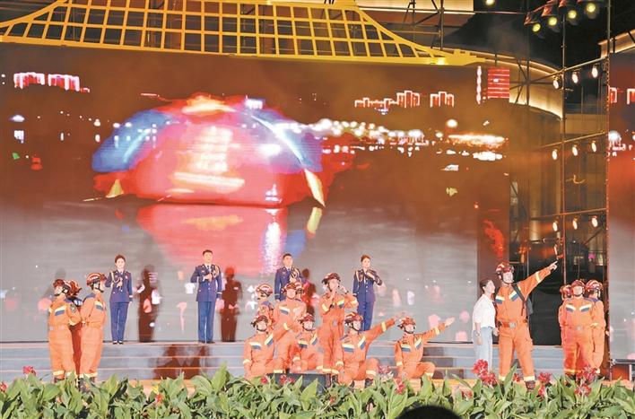 在“中国诗歌之城”八师石河子市第三届诵读大赛决赛现场,石河子市消防救援支队表演诵读作品《火焰蓝的青春》(资料图片)。兵团日报常驻记者 王艳 摄