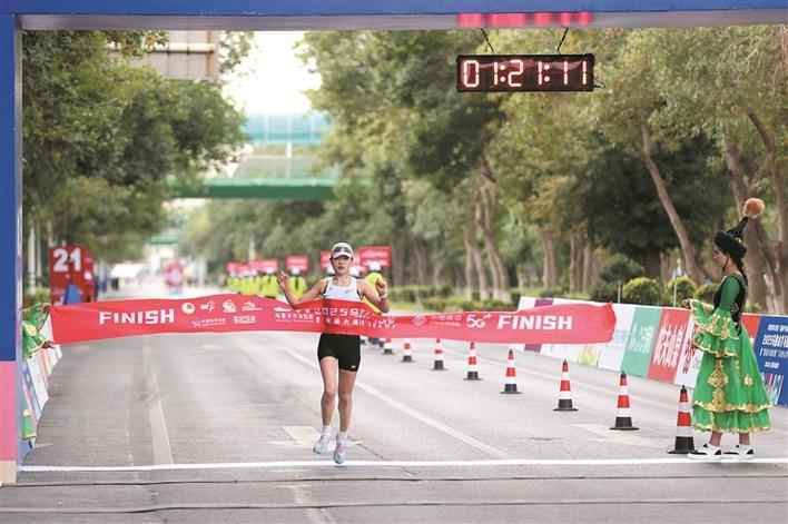 2025乌鲁木齐马拉松半程女子组冠军韩梦在终点冲刺(摄于8月31日)。韩梦 提供