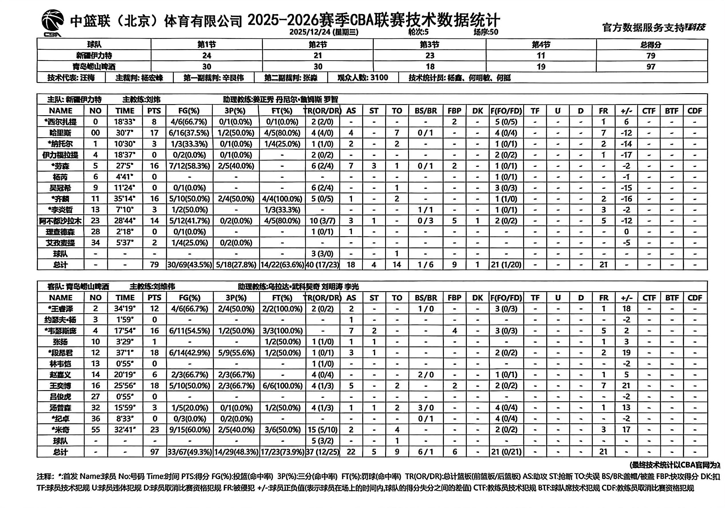 数据层面,新疆新外援凯文·哈里斯首秀贡献17分4篮板4助攻,成为球队进攻端重要火力点;齐麟手感稳定斩获16分5篮板,阿不都沙拉木则交出14分10篮板3助攻的数据。青岛方面,乔丹·米奇独揽23分15篮板的大号两双,王奕博、段昂君各得18分,外援韦瑟斯庞贡献16分7助攻,四人得分上双的均衡表现成为取胜关键。