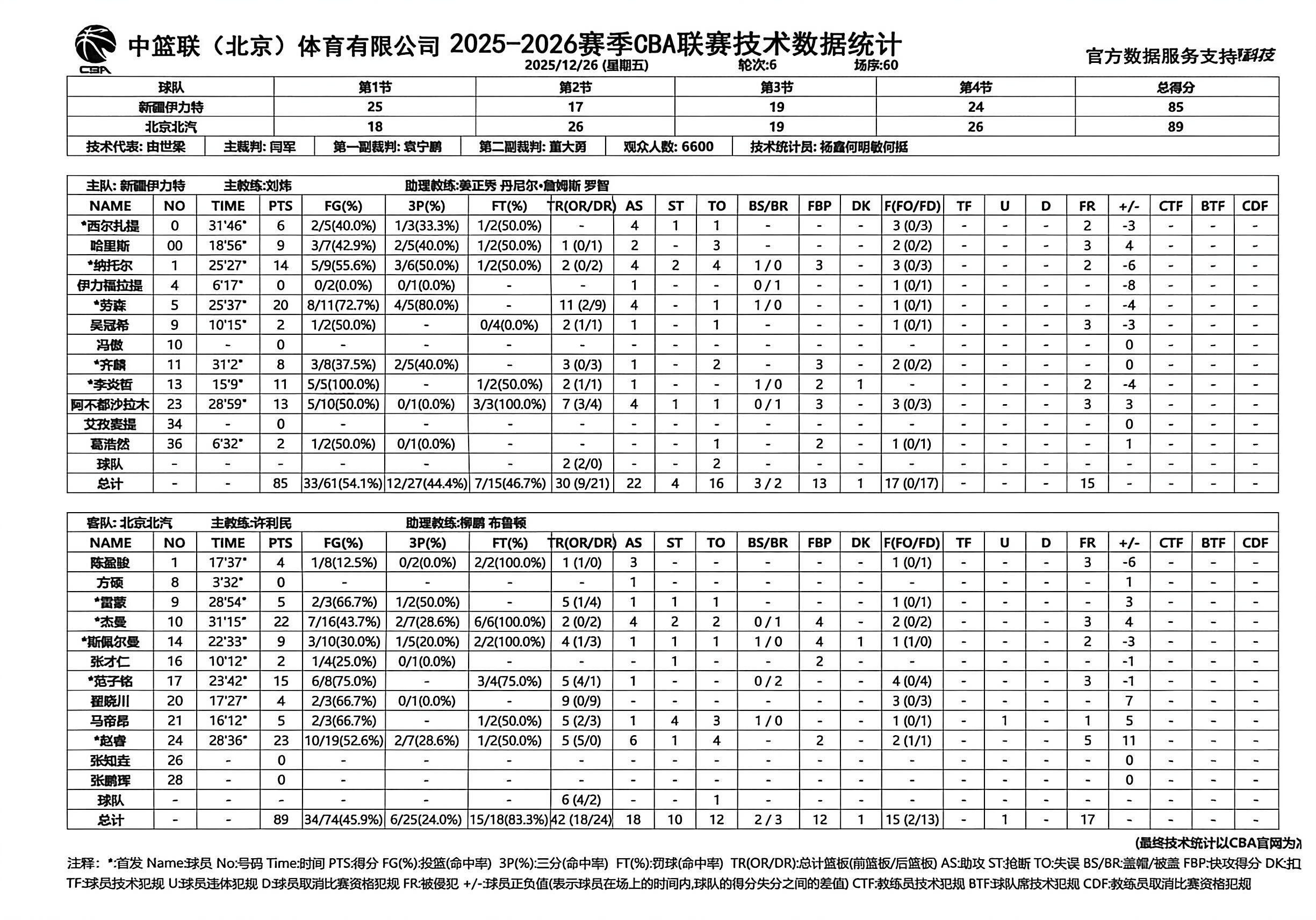 乌鲁木齐讯(胡杨网陈禧千子、丁娜娜 通讯员田园)2025年12月26日晚,十二师五一新区文体中心灯火通明,CBA常规赛第六轮一场焦点战在此上演。新疆伊力特坐镇主场迎战北京北汽,比赛全程紧张刺激,比分胶着直至终场哨响。最终,新疆伊力特以85∶89憾负对手,不仅吞下三连败苦果,还被北京北汽完成本赛季双杀;后者则凭借此胜豪取六连胜。赛场内球迷的欢呼声与惋惜的叹息声交织,这场惜败不仅暴露了新疆伊力特关键球处理的短板,更折射出球队战术体系与球员特点的适配困境。