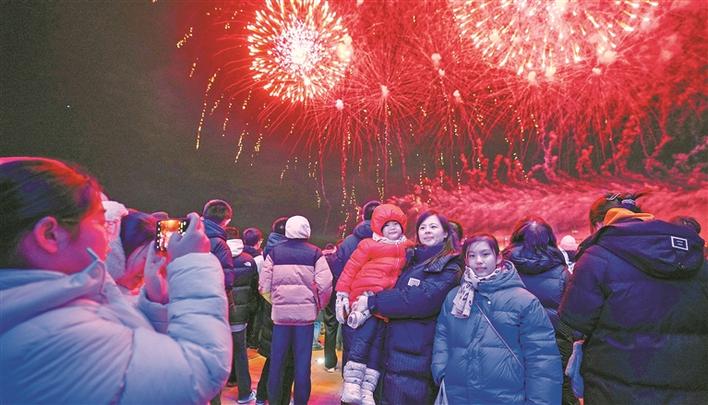 2025年12月31日晚,游客在十师北屯市第五届“冰城”文化旅游节开幕式上观看烟花、拍照留影。兵团日报常驻记者 李正虎 摄