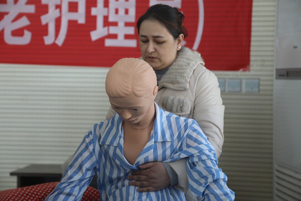 二连培训点上,养老护理员培训如火如荼。努尔艾合麦提·麦麦提跟着老师在模拟假人上反复练习海姆立克急救法,在老师的逐步纠正下,熟练掌握了规范动作与发力技巧:“参加养老护理员培训后,我学会了专业的护理知识和急救方法,还知道了饮食要健康,从吃饭开始避免‘三高’。”