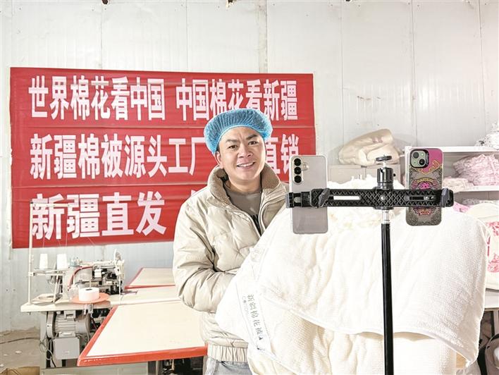 1月26日,一师十二团阿拉尔市木帛棉被加工厂负责人、主播彭陈以直播方式销售网套。朱志升 摄