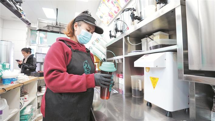 1月27日,在十师北屯市一家茶饮店内,店员为顾客制作茶饮。兵团日报常驻记者 李正虎 摄