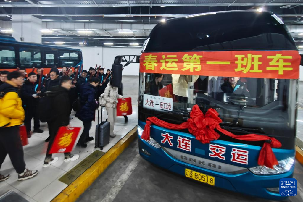 2月2日清晨,旅客在辽宁大连长途汽车站乘坐大连交运集团“春运第一班车”返乡。新华社发(刘德斌摄)
