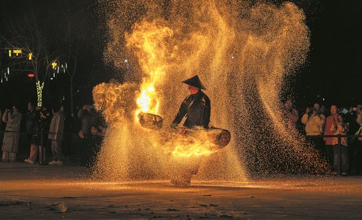 2月10日晚,火光流转、气势如虹的打火壶表演,为观众献上一场独具特色的民俗视觉盛宴。姬安妮 摄