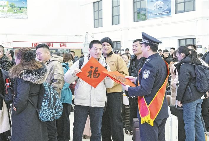“手写的春联才有年味,在回家路上收到这份祝福,心里特别暖。”旅客杨青将春联小心收好。一名车站值班人员收到“福”字后,将其立在服务台旁,为忙碌的春运现场增添了喜庆氛围。据统计,此次活动共送出春联300副、“福”字400张、年画挂历30幅,为春运旅途增添了浓浓年味。
