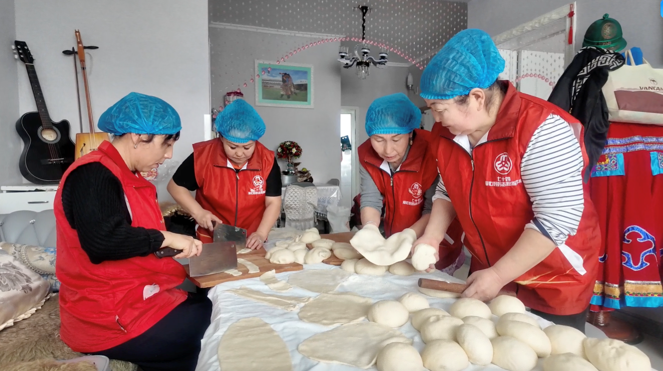 七十四团爱心妈妈巾帼志愿服务队队员们在家中制作油果准备分发给团场居民。