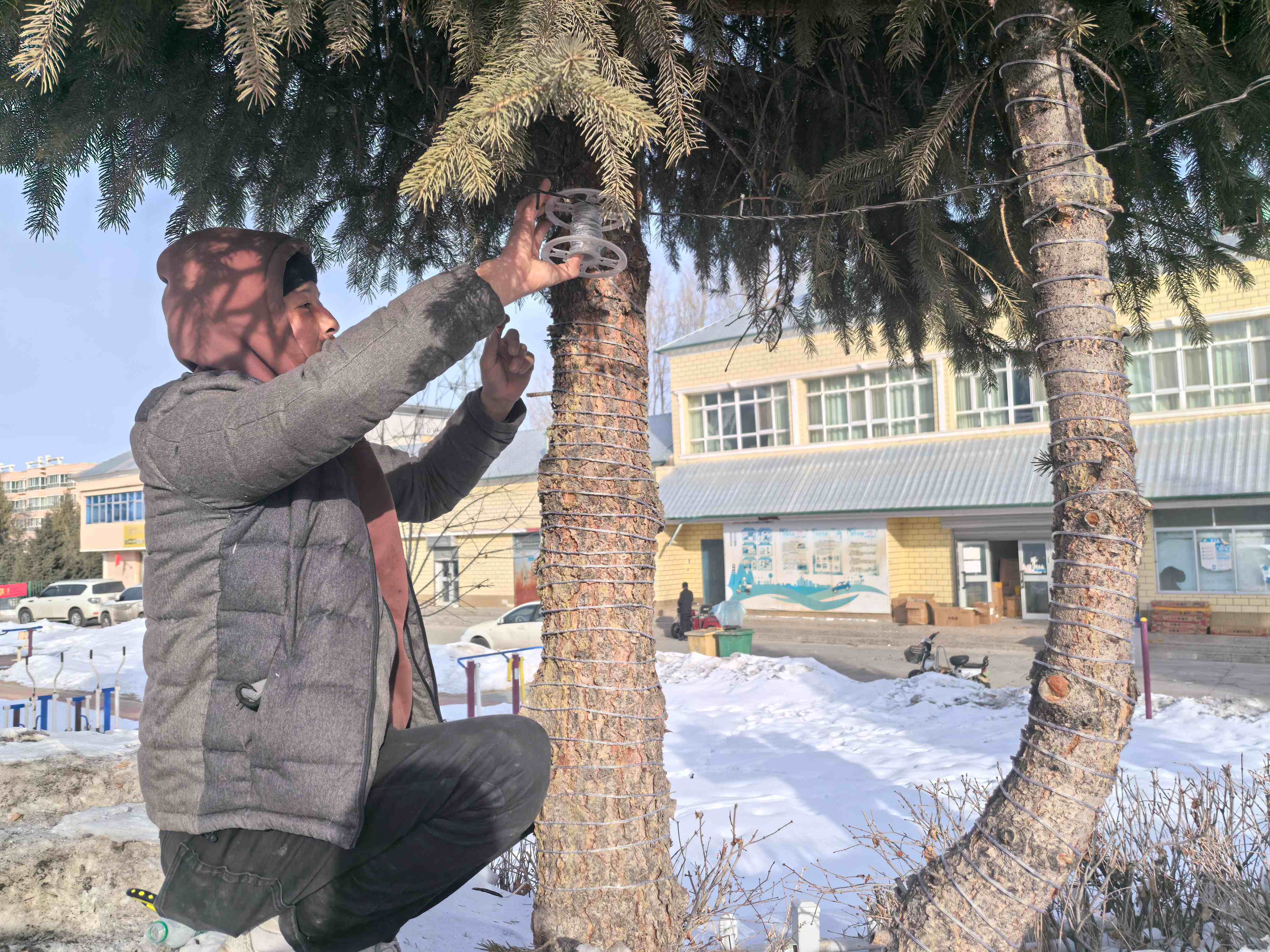 工人在布置道路边上的彩灯。胡杨网记者 李雨浪 摄