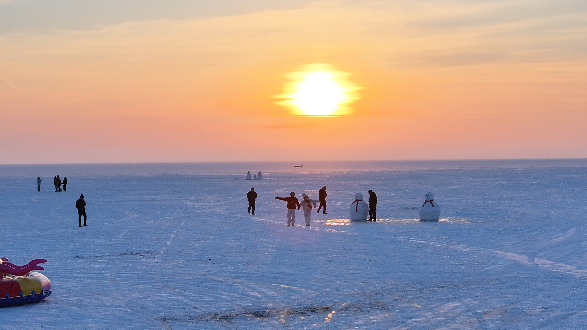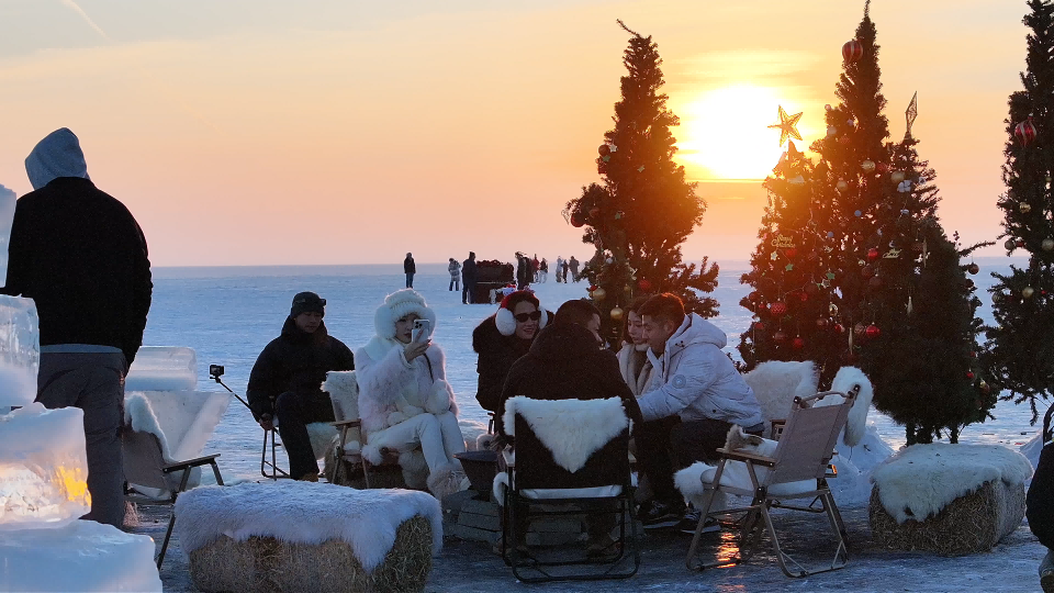 夕阳为冰封的布伦托海镀上一层暖金,游客们在雪雕旁漫步打卡。