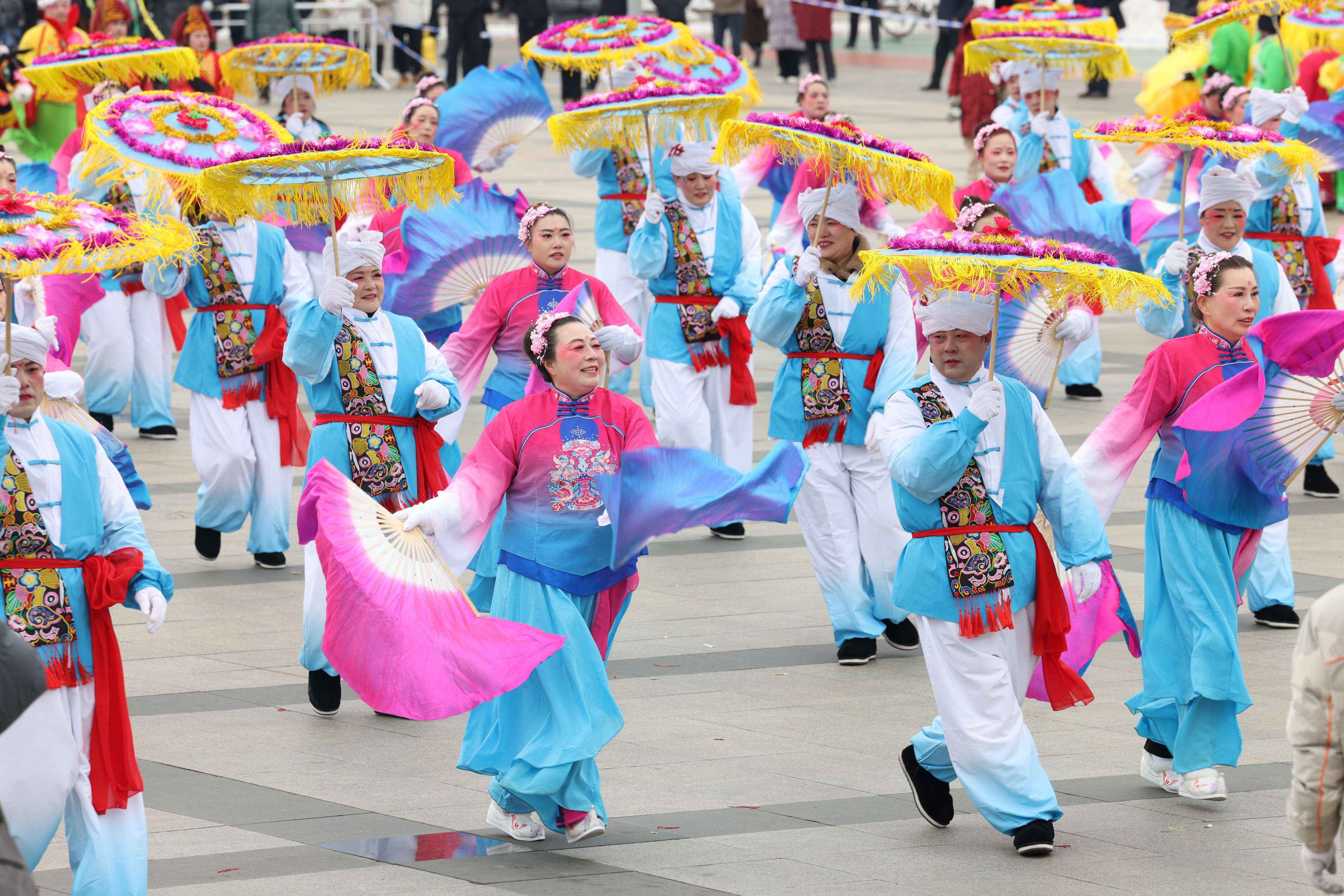秧歌队步伐欢快,彩扇飞舞。