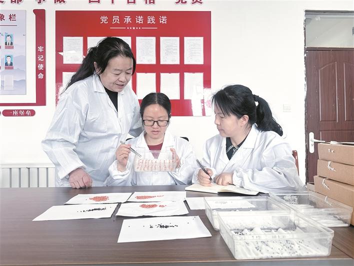 3月12日,在七十七团农业和林业草原中心,张芳(中)给技术人员讲解小麦发芽试验的操作步骤。兵团日报常驻记者 李惠 通讯员 高兴 摄