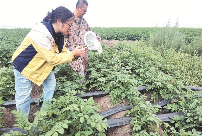 在七十七团一连的一块马铃薯地里,张芳(左)查看马铃薯病虫害防治情况(摄于2025年7月10日)。兵团日报常驻记者 李惠 通讯员 肖建伦 摄
