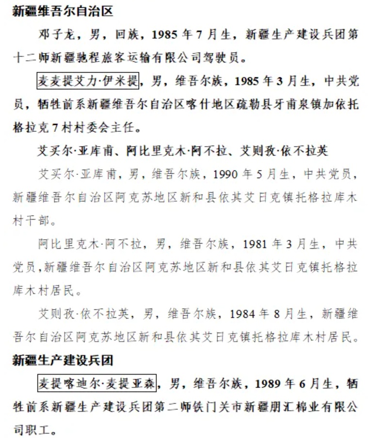 麦提喀迪尔·麦提亚森,男,维吾尔族,1989年6月生,牺牲前系新疆生产建设兵团第二师铁门关市新疆朋汇棉业有限公司职工。
