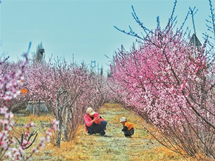 在二师二十二团三连的桃花林,游客在拍照打卡(资料图片)。焦栋栋 摄