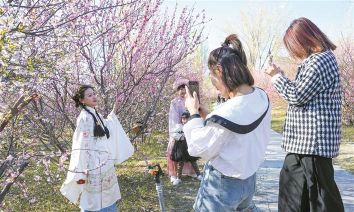 在十师北屯市得仁山生态公园,游客与盛放的榆叶梅合影留念(资料图片)。兵团日报常驻记者 李正虎 摄