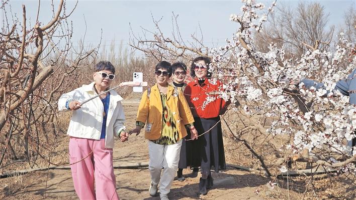 3月21日,游客在十二师二二一团杏花林里拍照打卡。赵林洁 摄