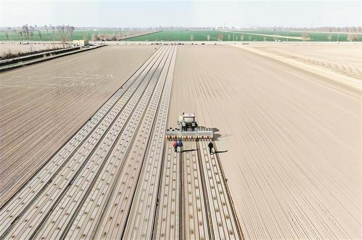 “往年这个时候要先浇地蓄墒,既费时又费水。现在用上‘干播湿出’技术,不用冬春灌,省水省力,出苗率还有保障。”赵康明一边查看播种进度,一边算起“节本增效账”,“配合二次点播模式,比传统大水漫灌能节省三分之二的用水量,人力成本也明显降低。”